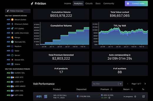 Friktion, one of the leading DeFi protocols on Solana is also trying to solve for yields. How? By offering access to DeFi-powered, risk-adjusted 🍃 return generation strategies for DAOs, individuals, and traditional institutions through institutional-grade structured products and risk management. It introduces cool concepts like Volts and Circuits into the DeFi ecosystem, which offers both active and passive portfolio management strategies.