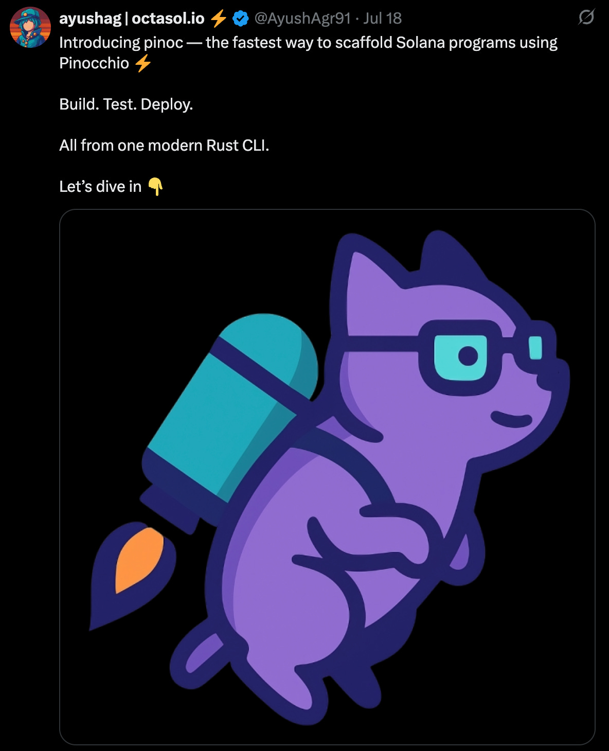 Ayush shipped Pinoc, a tool to scaffold Solana programs using Pinocchio. This is built on top of Chio by Arjun, who is also a Superteam member. You gotta love to see it.
