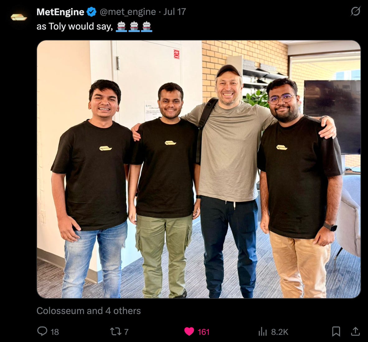 From the podium to SF, the Met Engine folks (Harsh, Neel and Vraj Desai) are cooking in SF. Breakout winners and the only team from India that has made to the Colosseum Accelerator — we can't wait for what they ship in the future.
