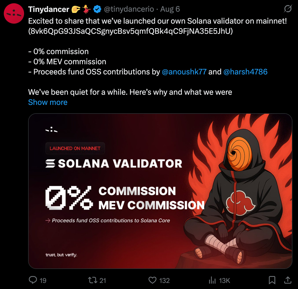 And this is a win too good not to include in the July update — OGs Anoushk and Harsh are back with Tinydancer and they just launched their own Solana validator on mainnet.