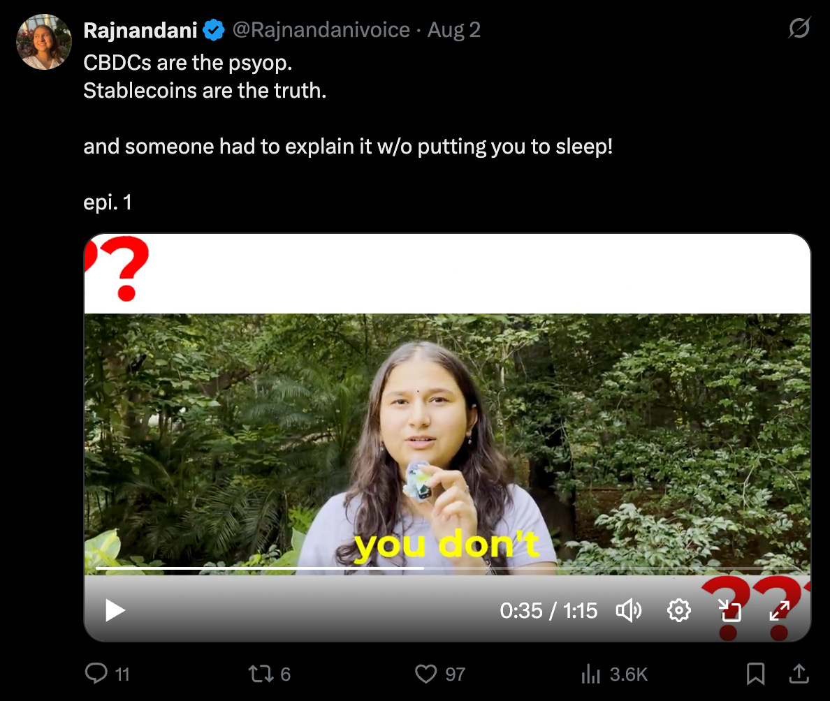 We're also seeing an emergence of members embracing their creator arcs and becoming nCMOs of Solana. Rajnandani is leading the way with a three-part series on stablecoins — first video is out here. More to come!
